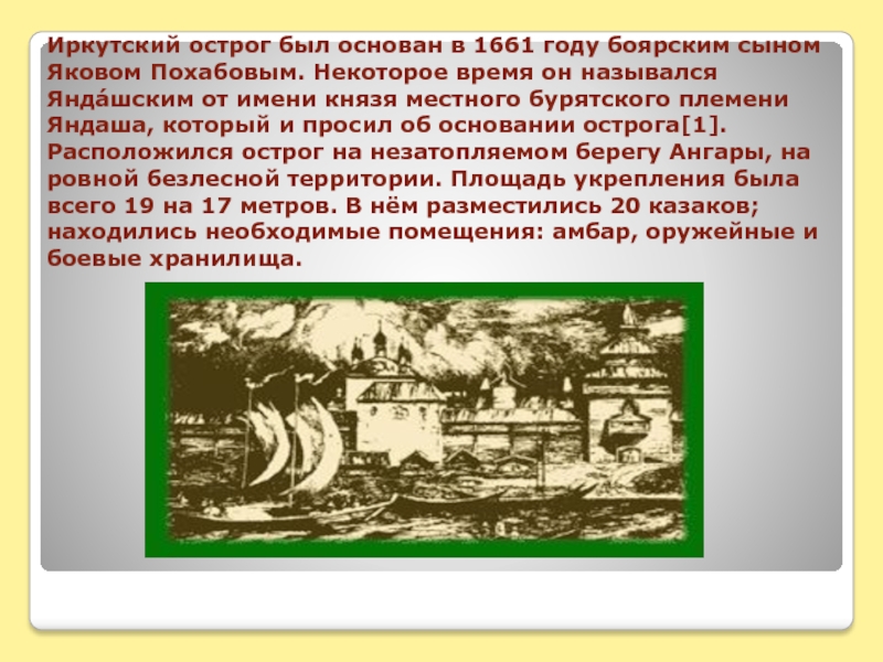 Слайд 6Иркутский острог был основан в 1661 году боярским сыном Яковом Похабовым.
