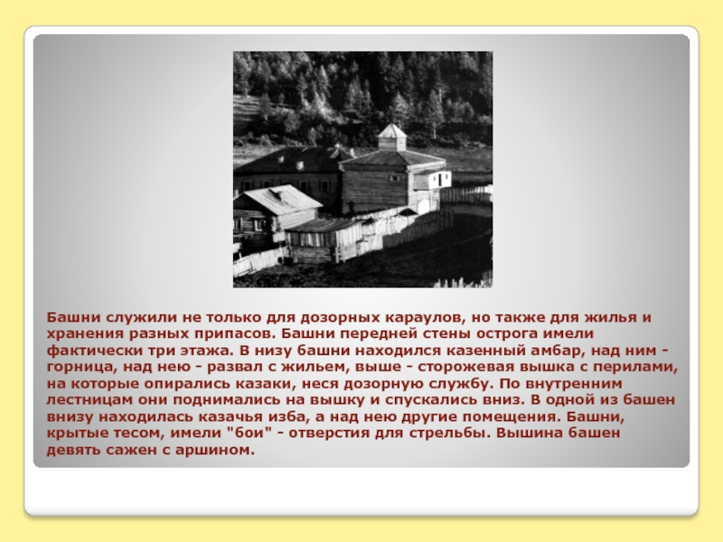 и хранения разных припасов. Башни передней стены острога имели фактически три этажа. В низу башни находился казенный амбар, над ним - горница, над нею - развал с жильем, выше - сторожевая вышка с перилами, на которые опирались казаки, неся дозорную службу. По внутренним лестницам они поднимались на вышку и спускались вниз. В одной из башен внизу находилась казачья изба, а над нею другие помещения. Башни, крытые тесом, имели "бои" - отверстия для стрельбы. Вышина башен девять сажен с аршином.