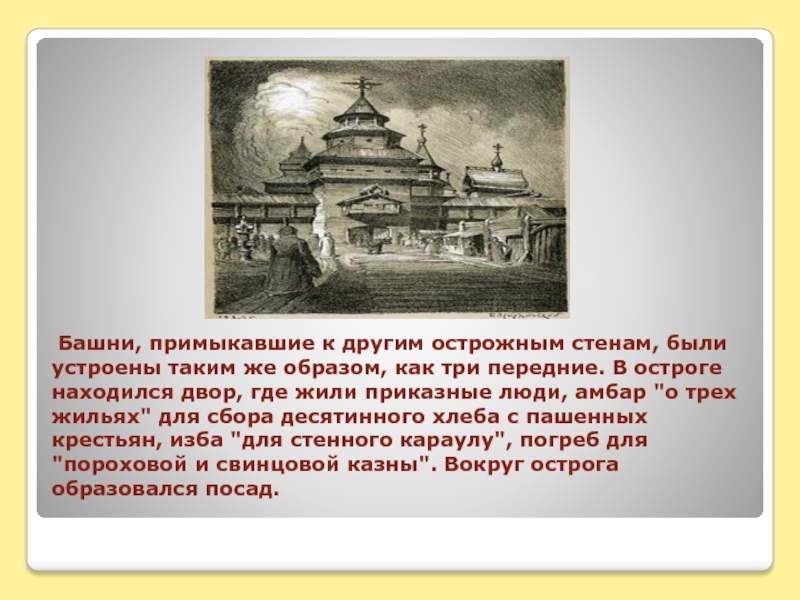 образом, как три передние. В остроге находился двор, где жили приказные люди, амбар "о трех жильях" для сбора десятинного хлеба с пашенных крестьян, изба "для стенного караулу", погреб для "пороховой и свинцовой казны". Вокруг острога образовался посад.