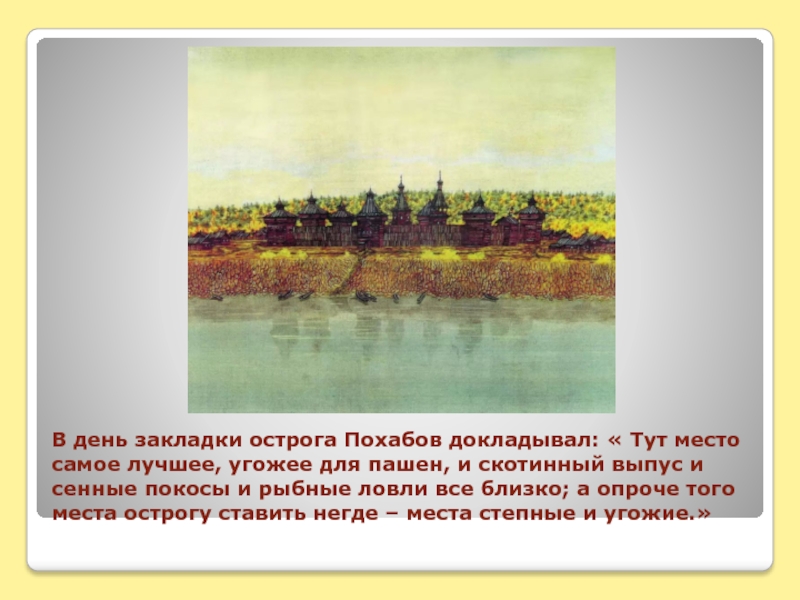 Слайд 7В день закладки острога Похабов докладывал: « Тут место самое лучшее,