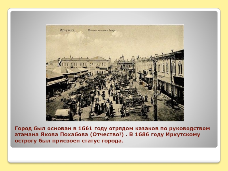 Якова Похабова (Отчество!) . В 1686 году Иркутскому острогу был присвоен статус города.