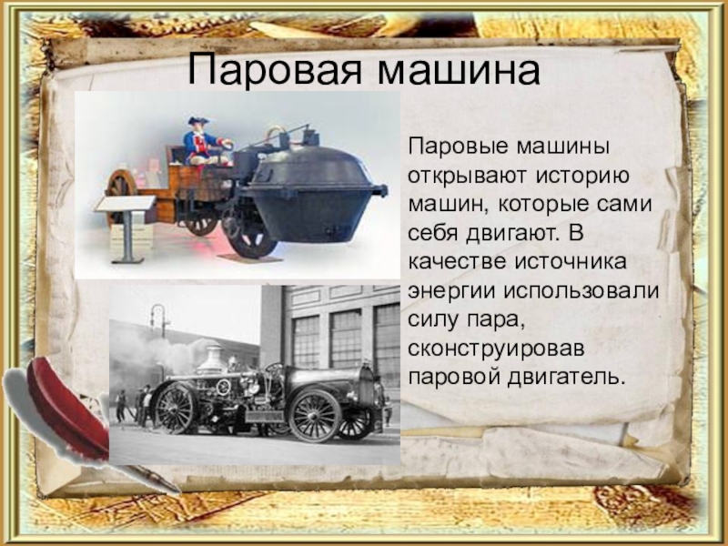 Паровая машинаПаровые машины открывают историю машин, которые сами себя двигают. В качестве источника энергии использовали силу пара,