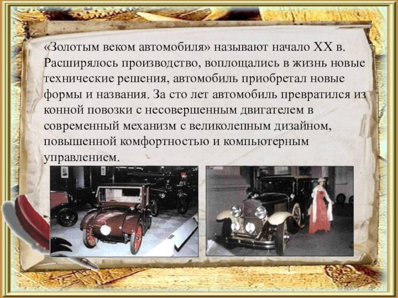 Слайд 11«Золотым веком автомобиля» называют начало XX в. Расширялось производство, воплощались в