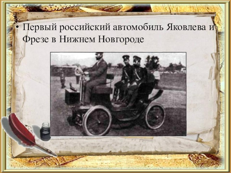Слайд 10Первый российский автомобиль Яковлева и Фрезе в Нижнем Новгороде