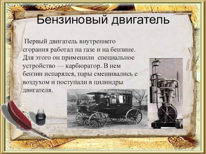 Бензиновый двигатель Первый двигатель внутреннего сгорания работал на газе и на бензине. Для этого он применили специальное