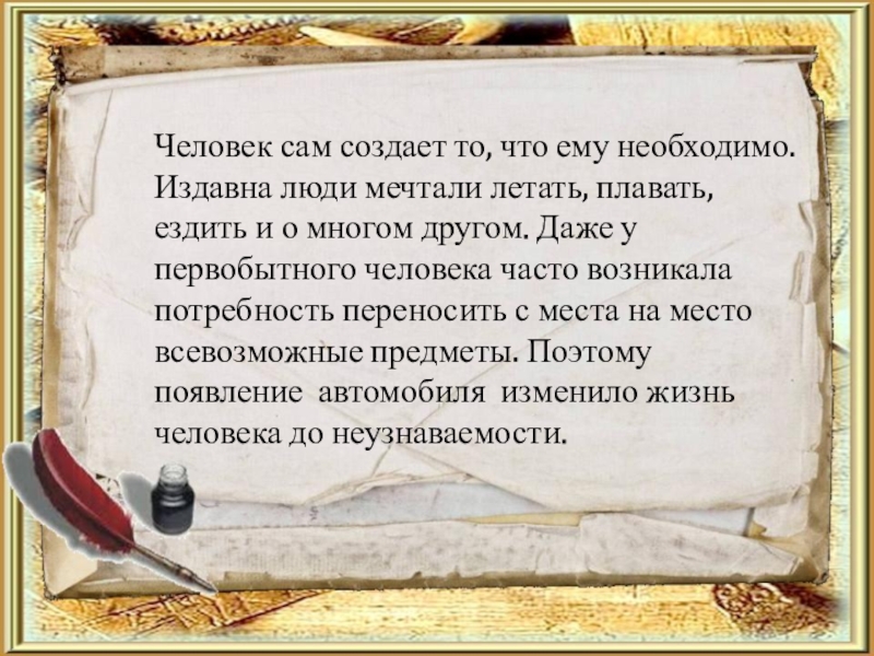 Человек сам создает то, что ему необходимо. Издавна люди мечтали летать, плавать, ездить и о многом другом. Даже у первобытного человека часто возникала потребность переносить с места на место всевозможные предметы. Поэтому появление автомобиля изменило жизнь