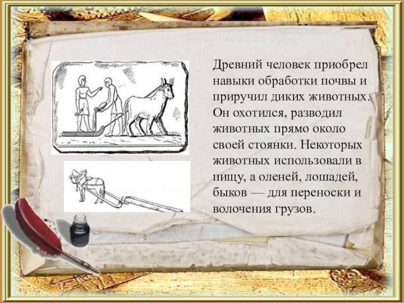 Древний человек приобрел навыки обработки почвы и приручил диких животных. Он охотился, разводил животных прямо около своей