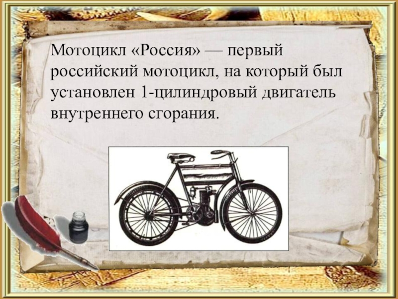 Слайд 12Мотоцикл «Россия» — первый российский мотоцикл, на который был установлен 1-цилиндровый