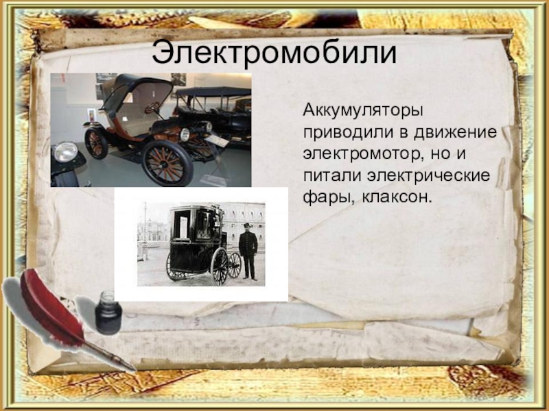 ЭлектромобилиАккумуляторы приводили в движение электромотор, но и питали электрические фары, клаксон.