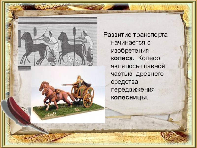 Развитие транспорта начинается с изобретения - колеса. Колесо являлось главной частью древнего средства передвижения - колесницы.