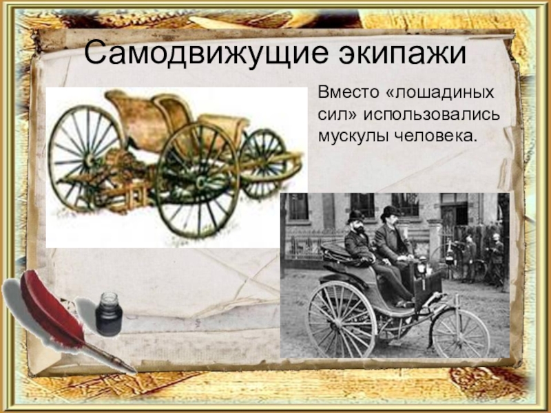Самодвижущие экипажиВместо «лошадиных сил» использовались мускулы человека.