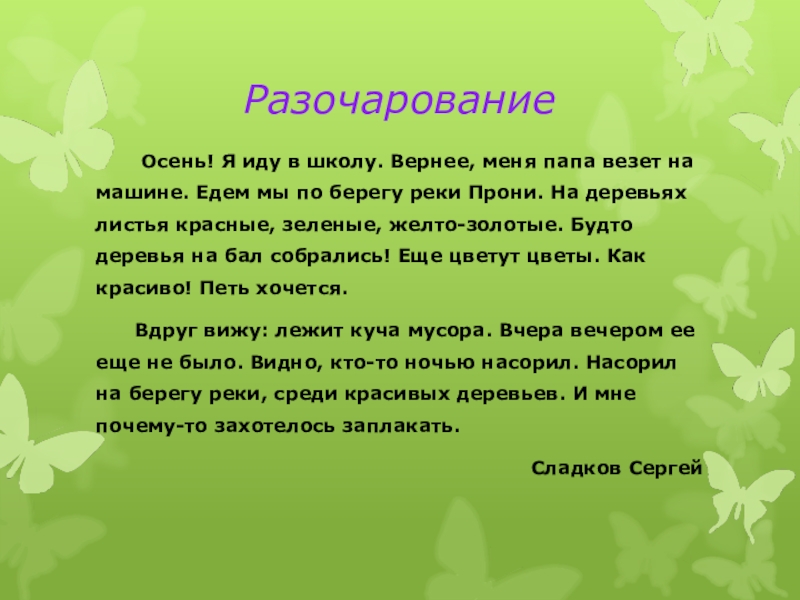 Вдруг вижу: лежит куча мусора. Вчера вечером ее еще не было. Видно, кто-то ночью насорил. Насорил на берегу реки, среди красивых деревьев. И мне почему-то захотелось заплакать.