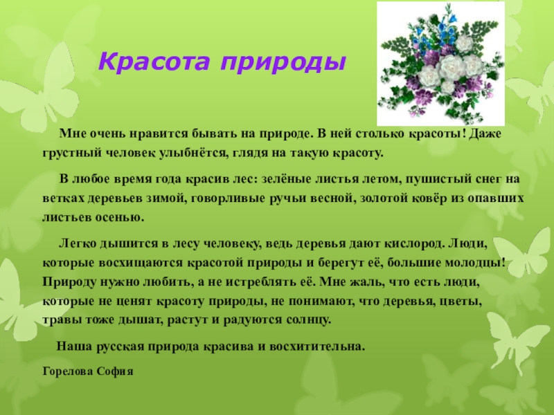 Легко дышится в лесу человеку, ведь деревья дают кислород. Люди, которые восхищаются красотой природы и берегут её, большие молодцы! Природу нужно любить, а не истреблять её. Мне жаль, что есть люди, которые не ценят красоту природы, не понимают, что деревья, цветы, травы тоже дышат, растут и радуются солнцу.