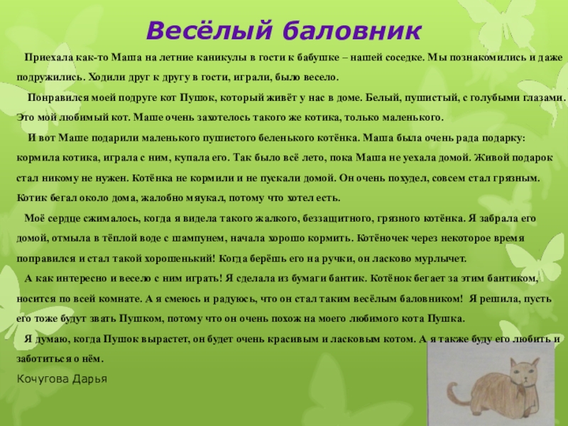 А как интересно и весело с ним играть! Я сделала из бумаги бантик. Котёнок бегает за этим бантиком, носится по всей комнате. А я смеюсь и радуюсь, что он стал таким весёлым баловником! Я решила, пусть его тоже будут звать Пушком, потому что он очень похож на моего любимого кота Пушка.