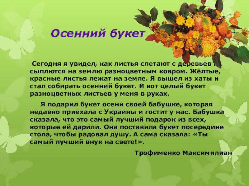 Я подарил букет осени своей бабушке, которая недавно приехала с Украины и гостит у нас. Бабушка сказала, что это самый лучший подарок из всех, которые ей дарили. Она поставила букет посередине стола, чтобы радовал душу. А сама сказала: «Ты самый лучший внук на свете!».