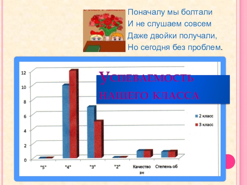 Поначалу мы болталиИ не слушаем совсемДаже двойки получали,Но сегодня без проблем.Успеваемость нашего класса