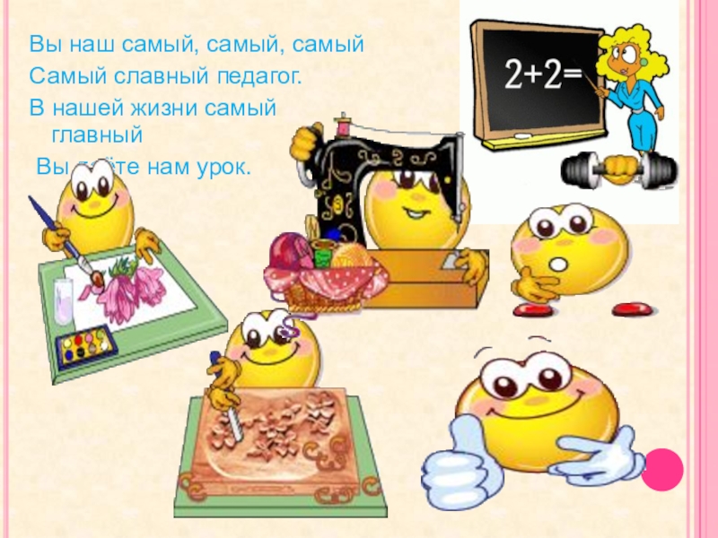 Вы наш самый, самый, самыйСамый славный педагог.В нашей жизни самый главный Вы даёте нам урок.