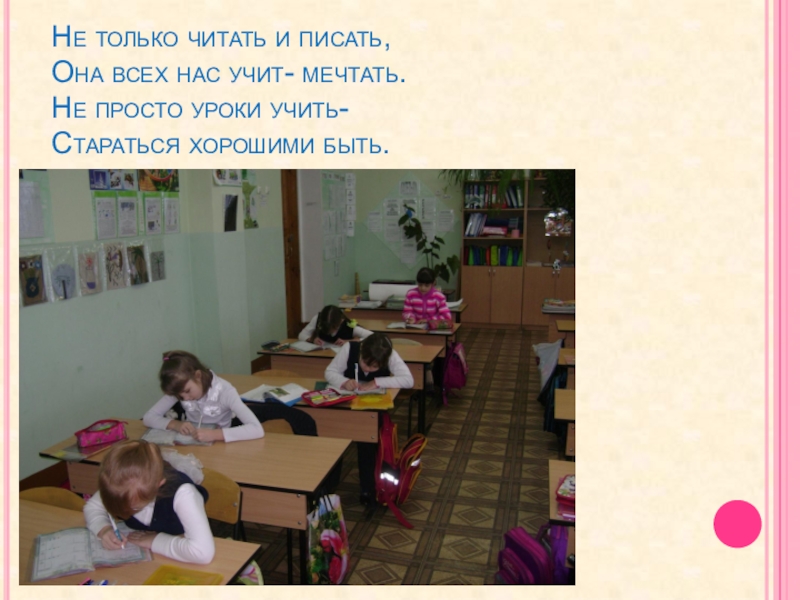Слайд 4Не только читать и писать, Она всех нас учит- мечтать. Не просто уроки