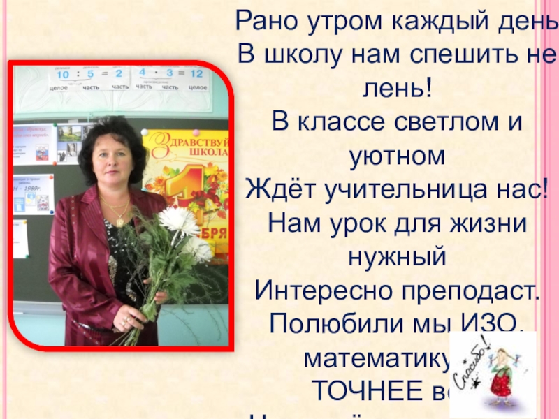 Рано утром каждый деньВ школу нам спешить не лень!В классе светлом и уютномЖдёт учительница нас!Нам урок для жизни нужныйИнтересно преподаст.Полюбили мы ИЗО, математику …ТОЧНЕЕ всё,Что ведёт у нас одна –Ершова Ольга Валерьевна