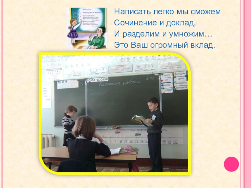 Написать легко мы сможем Сочинение и доклад,И разделим и умножим…Это Ваш огромный вклад.