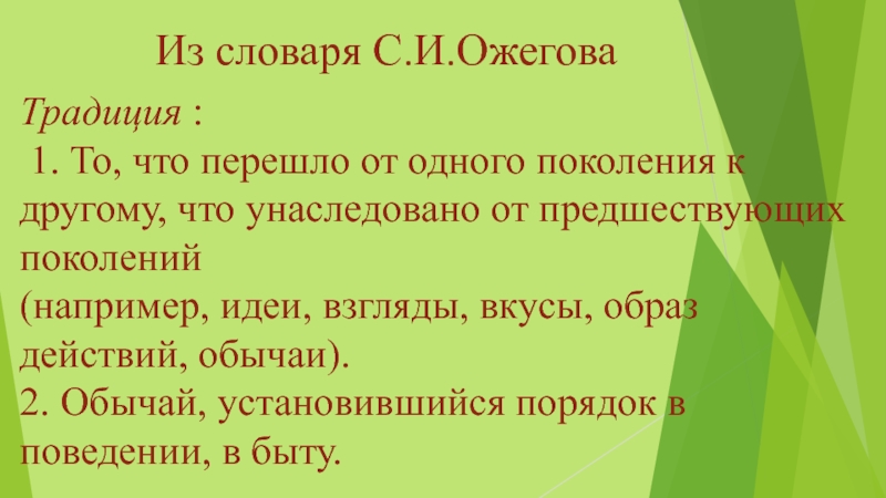 Из словаря С.И.ОжеговаТрадиция : 1. То, что перешло от одного поколения к другому, что унаследовано от предшествующих поколений (например, идеи, взгляды, вкусы, образ действий, обычаи). 2. Обычай, установившийся порядок в поведении, в