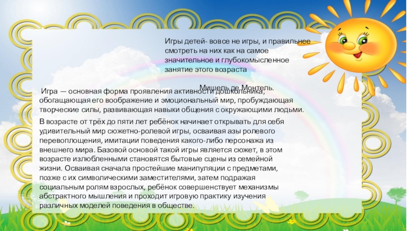 Игра — основная форма проявления активности дошкольника, обогащающая его воображение и эмоциональный мир, пробуждающая творческие силы, развивающая навыки общения с окружающими людьми.