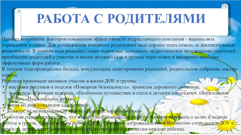 взаимосвязь учреждения и семьи. Для установления контакта с родителями надо хорошо знать семью, ее воспитательные возможности. В течение года решались такие задачи как: психолого- педагогическое просвещение родителей, приобщение родителей к участию в жизни детского сада и группы через поиск и внедрение наиболее эффективных форм работы.
