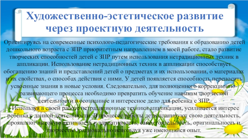 образованию детей дошкольного возраста с ЗПР приоритетным направлением в моей работе, стало развитие творческих способностей детей с ЗПР путем использования нетрадиционных техник в аппликации. Использование нетрадиционных техник в аппликации способствует обогащению знаний и представлений детей о предметах и их использовании, о материалах и их свойствах, о способах действия с ними. У детей появляется способность переносить усвоенные знания в новые условия. Следовательно, для полноценного коррекционно-развивающего процесса необходимо превратить обучение навыкам творческой деятельности в осознанное и интересное дело для ребенка с ЗПР.