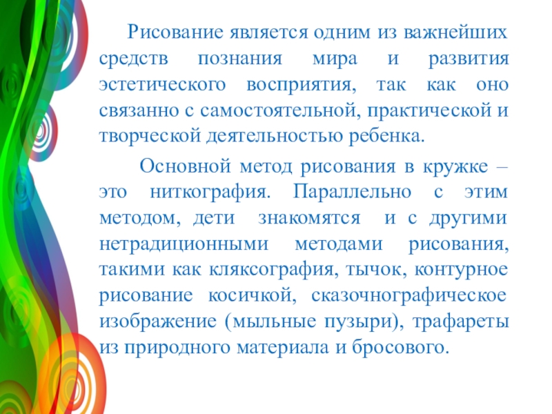 Основной метод рисования в кружке – это ниткография. Параллельно с этим методом, дети знакомятся и с другими нетрадиционными методами рисования, такими как кляксография, тычок, контурное рисование косичкой, сказочнографическое изображение (мыльные пузыри), трафареты из природного материала и бросового.