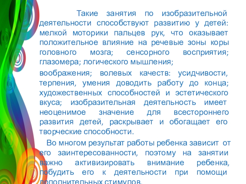 Слайд 17 Такие занятия по изобразительной деятельности способствуют развитию у