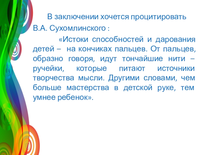 «Истоки способностей и дарования детей – на кончиках пальцев. От пальцев, образно говоря, идут тончайшие нити – ручейки, которые питают источники творчества мысли. Другими словами, чем больше мастерства в детской руке, тем умнее ребенок».