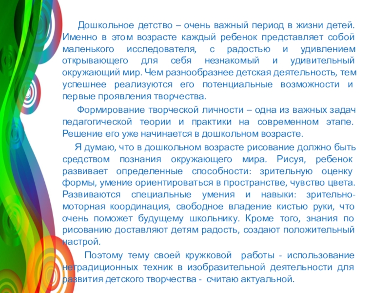 Поэтому тему своей кружковой работы - использование нетрадиционных техник в изобразительной деятельности для развития детского творчества - считаю актуальной.