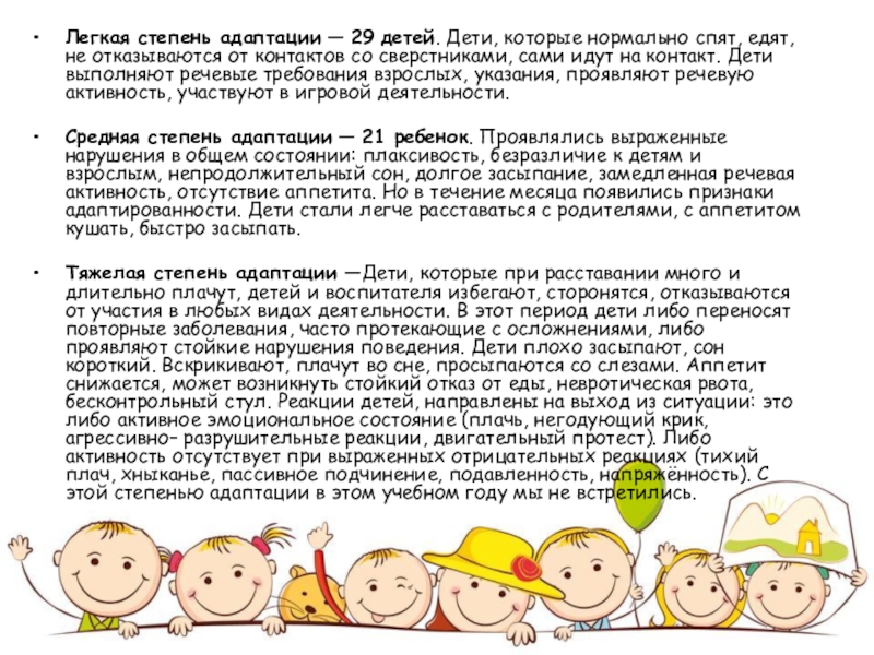 Слайд 4Легкая степень адаптации — 29 детей. Дети, которые нормально спят, едят,
