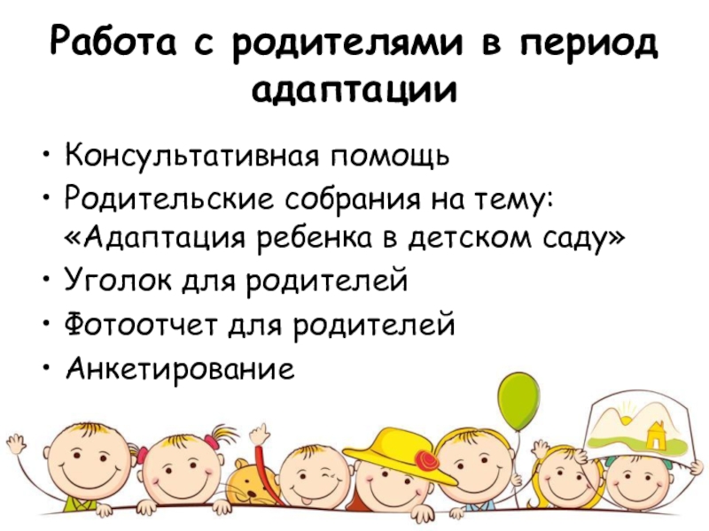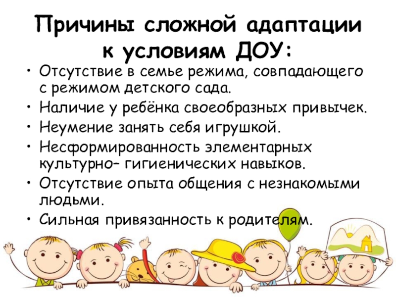 Средняя степень адаптации — 21 ребенок. Проявлялись выраженные нарушения в общем состоянии: плаксивость, безразличие к детям и взрослым, непродолжительный сон, долгое засыпание, замедленная речевая активность, отсутствие аппетита. Но в течение месяца появились признаки адаптированности. Дети стали легче расставаться с родителями, с аппетитом кушать, быстро засыпать.