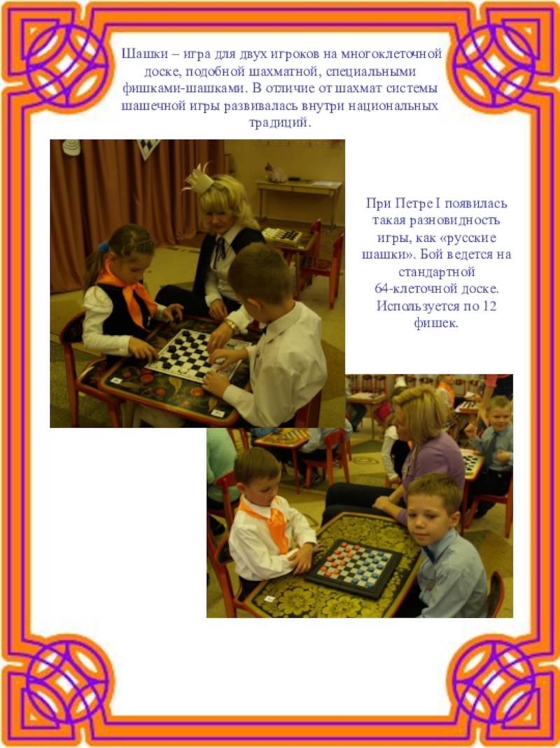 При Петре I появилась такая разновидность игры, как «русские шашки». Бой ведется на стандартной