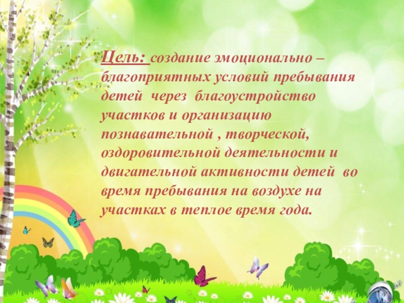 Слайд 2Цель: создание эмоционально – благоприятных условий пребывания детей через благоустройство участков