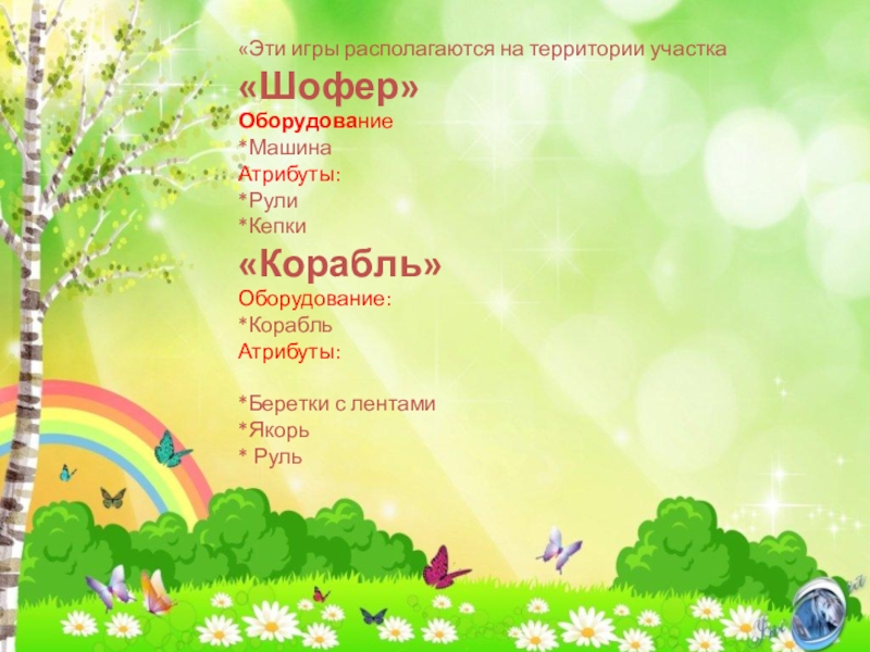 Обязательно выносится на участок оборудование для развития движений, спортивных игр: