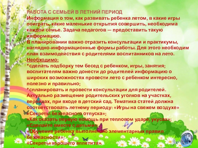 воспитателям важно донести до родителей информацию о широких возможностях провести лето с ребенком интересно, полезно и правильно;