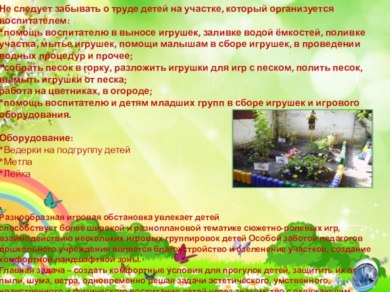 Слайд 13Не следует забывать о труде детей на участке, который организуется воспитателем: