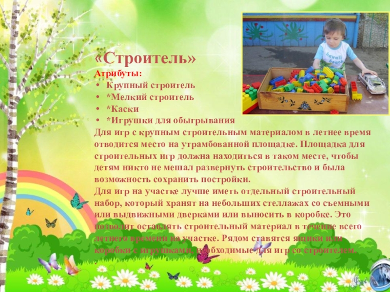 летнее время отводится место на утрамбованной площадке. Площадка для строительных игр должна находиться в таком месте, чтобы детям никто не мешал развернуть строительство и была возможность сохранить постройки.