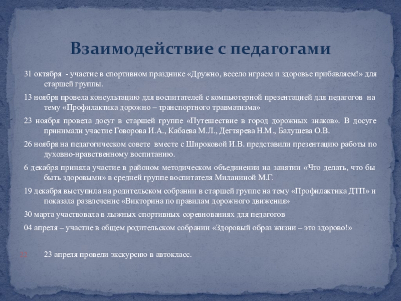 13 ноября провела консультацию для воспитателей с компьютерной презентацией для педагогов на тему «Профилактика дорожно – транспортного травматизма»