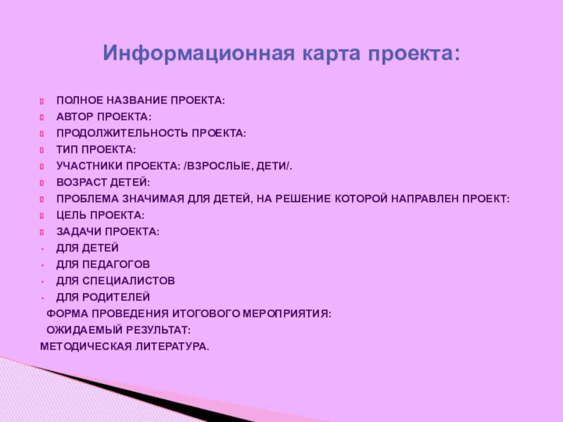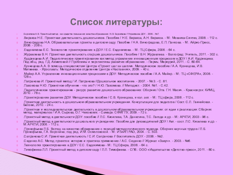 .Проектный метод в деятельности ДОУ: пособие // Л.С. Кисилева, Т.А. Данилина, Т.С. Лагода и др. - М.: АРКТИ, 2003 - 96 с.