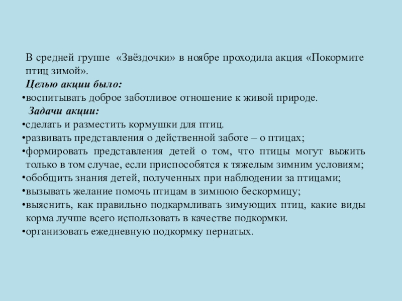 В средней группе «Звёздочки» в ноябре проходила акция «Покормите птиц зимой».Целью акции было: воспитывать доброе заботливое отношение к живой природе. Задачи акции:сделать и разместить кормушки для птиц. развивать представления о действенной заботе – о птицах;формировать представления