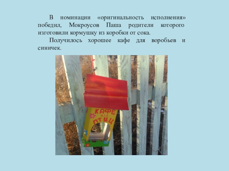 Слайд 8В номинации «оригинальность исполнения» победил, Мокроусов Паша родители которого изготовили кормушку