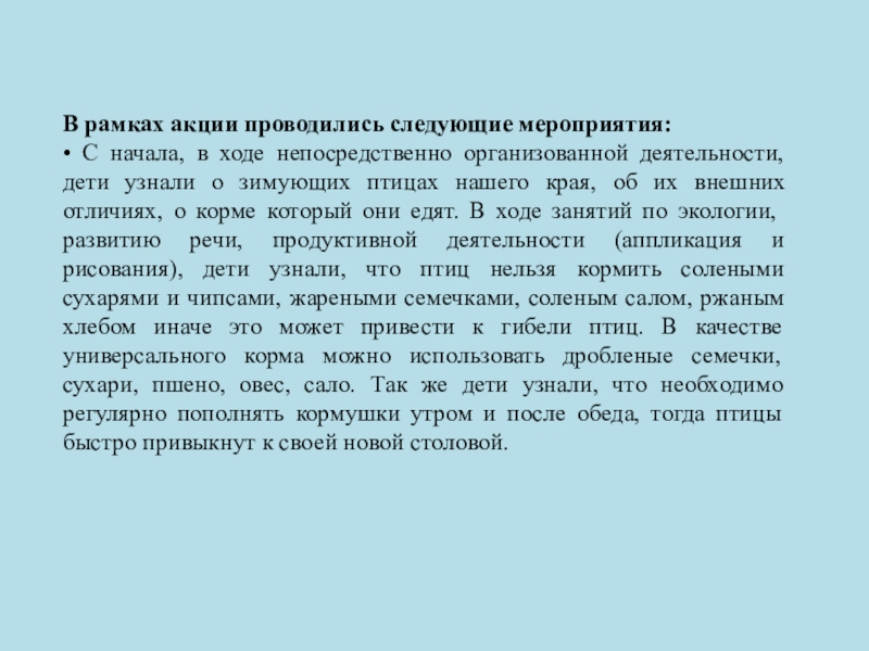 В рамках акции проводились следующие мероприятия:• С начала, в ходе непосредственно организованной деятельности, дети узнали о зимующих