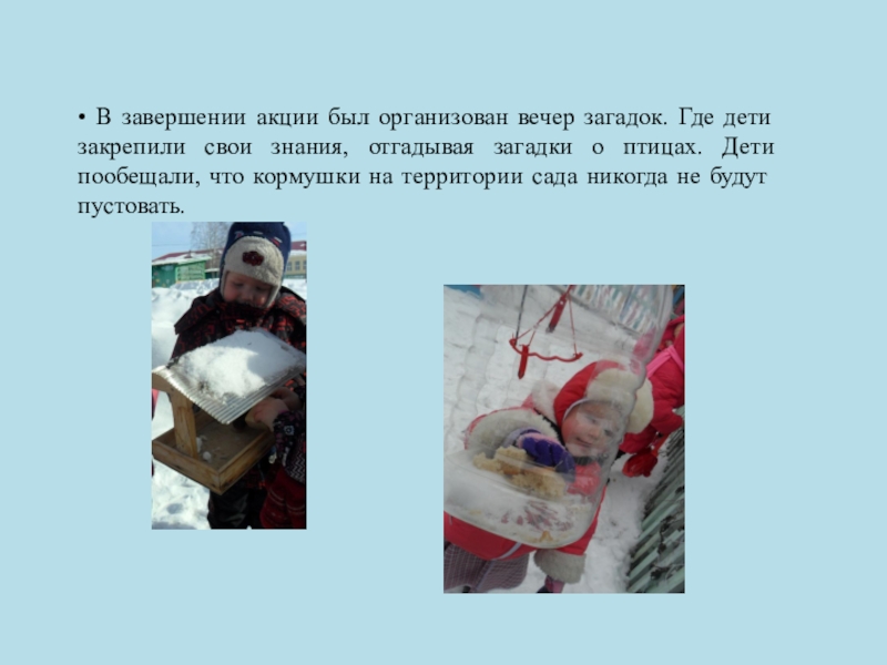 • В завершении акции был организован вечер загадок. Где дети закрепили свои знания, отгадывая загадки о птицах.