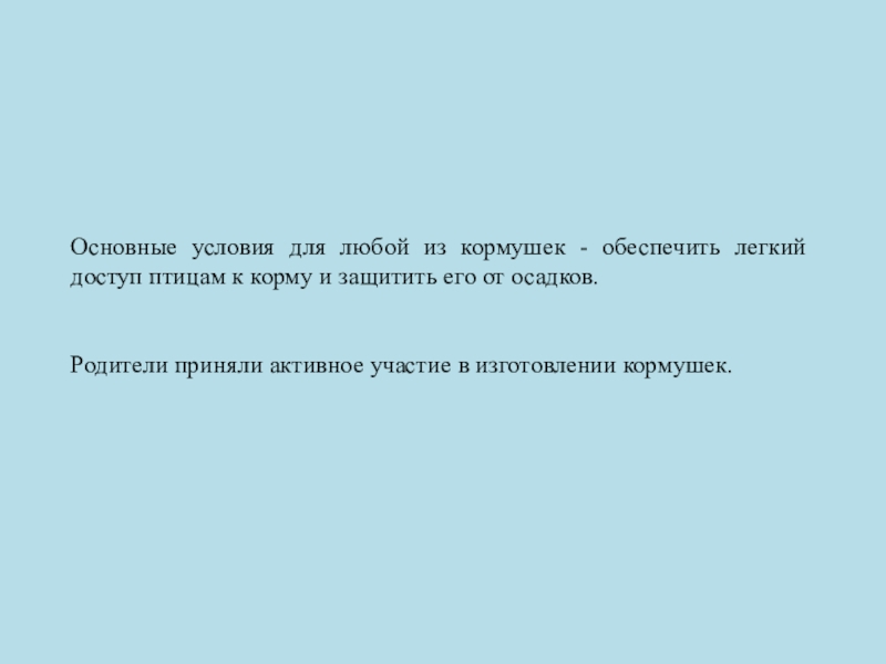 Слайд 6Основные условия для любой из кормушек - обеспечить легкий доступ птицам