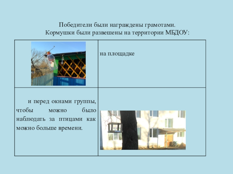 Победители были награждены грамотами.Кормушки были развешены на территории МБДОУ: