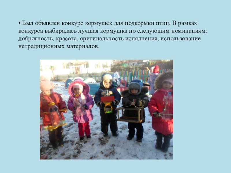 Слайд 5• Был объявлен конкурс кормушек для подкормки птиц. В рамках конкурса