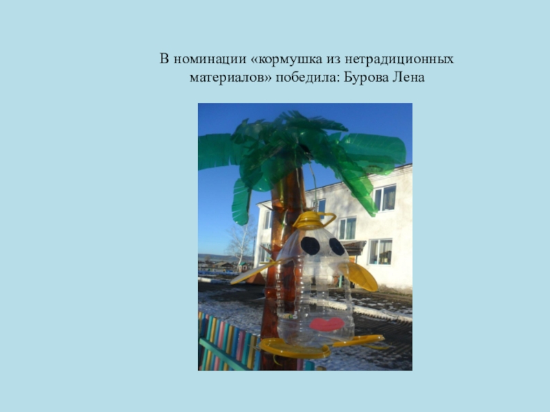 Слайд 7В номинации «кормушка из нетрадиционных материалов» победила: Бурова Лена